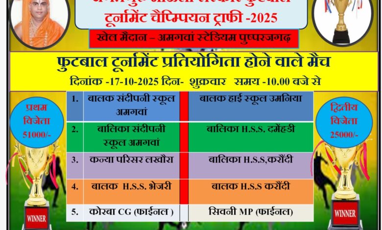अनूपपुर। जगत गुरु मौली सरकार अंतरराज्यीय फुटबॉल टूर्नामेंट अमगवां पुष्पराजगढ़ अनूपपुर में चल रहे फुटबॉल प्रतियोगिता की लोकप्रियता दिनों दिन बढ़ रही है दअरसल मावली सरकार ने इसका नाम गांव जोड़ो अभियान दिया है.नर्मदा अंचल वीर युवा संगठन एवं अनूपपुर जिला भाजपा  अध्यक्ष हीरा सिंह श्याम मित्र मंडली के नेतृत्व में आयोजित पुष्पराजगढ़ में जगत गुरु मौली सरकार अंतरराज्यीय फुटबॉल टूर्नामेंट 2025 अमगवां ग्राम जोड़ो अभियान का रोमांच जारी है, जिसमें देश के कोने-कोने से प्रतिभाशाली फुटबॉल खिलाड़ी हिस्सा ले रहे हैं। 3 अक्टूबर से जारी इस  टूर्नामेंट का आज समापन हो जायेगा।  पिछले 3 अक्टूबर से 17 अक्टूबर  तक आयोजित इस टूर्नामेंट में मध्य प्रदेश, छत्तीसगढ़, ओडिशा, महाराष्ट्र, दिल्ली और अन्य राज्यों की टीमें शामिल हुई।  जिसमें विजेता टीम को 51,000 रुपये और उपविजेता टीम को 25,000 रुपये की नगद राशि भी  प्रदान की जाएगी।